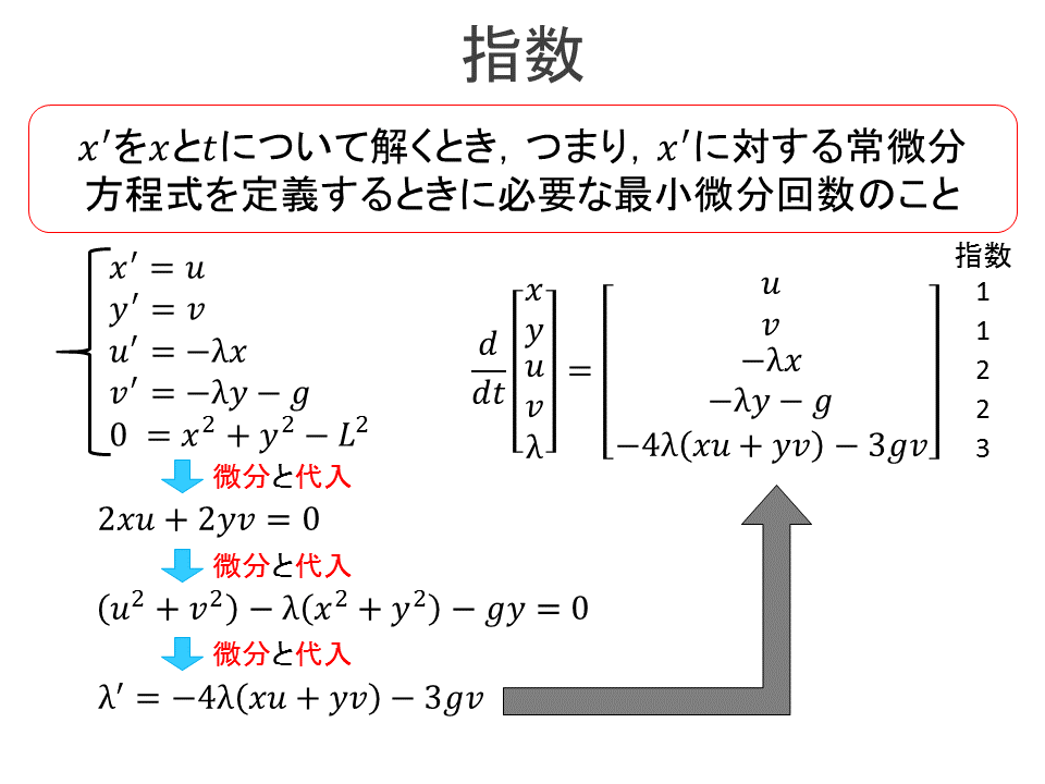ヤコビ行列Jの設定public void feval(int neqn, double t, double[] y, double[] yprime, double[] f, int[] ierr, double[] rpar, int[] ipar) { // f(t,x) f[0] = y[2]; f[1] = y[3]; f[2] = -y[4] * y[0]; f[3] = -y[4] * y[1] - 9.8; f[4] = y[0] * y[0] + y[1] * y[1] - 1; }