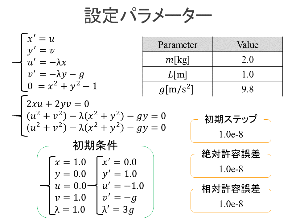 上記の問題を解くために必要な情報として各変数の指数、初期条件(初期値、初期微分値)、各物理定数の値、各シミュレーションパラメーターを決定します。