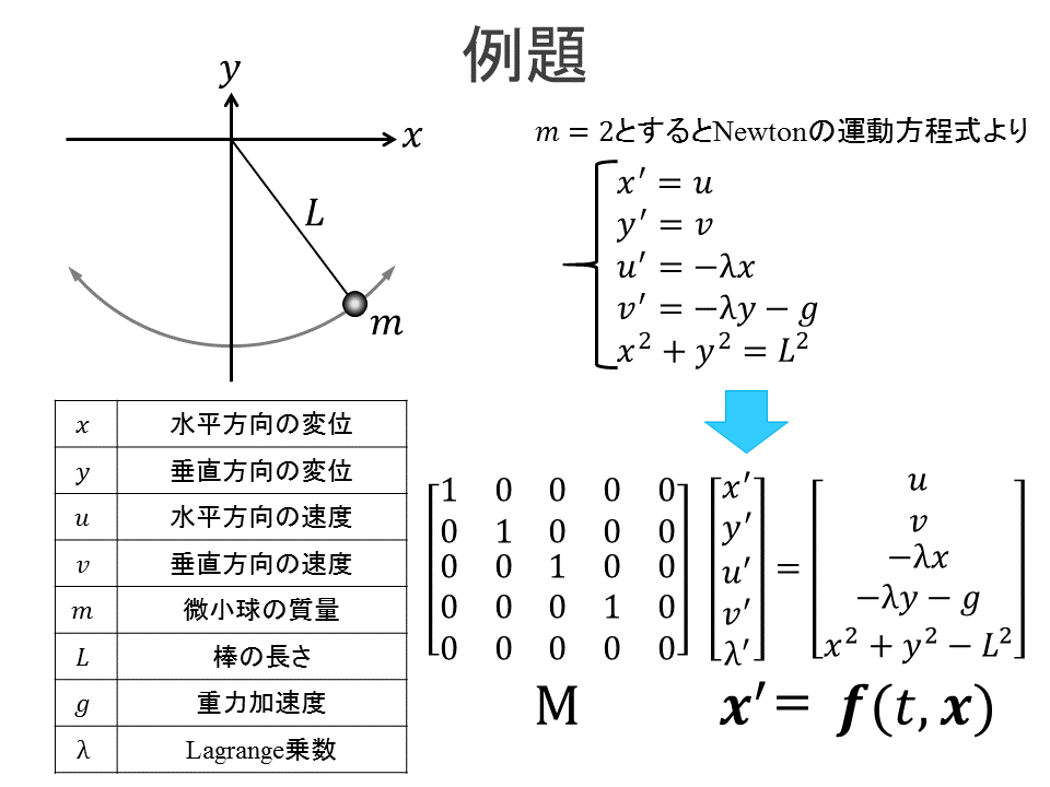ここからは例題を用いて説明します。用いる例題は以下の図の線形陰的なDAEで表される振り子の問題です。