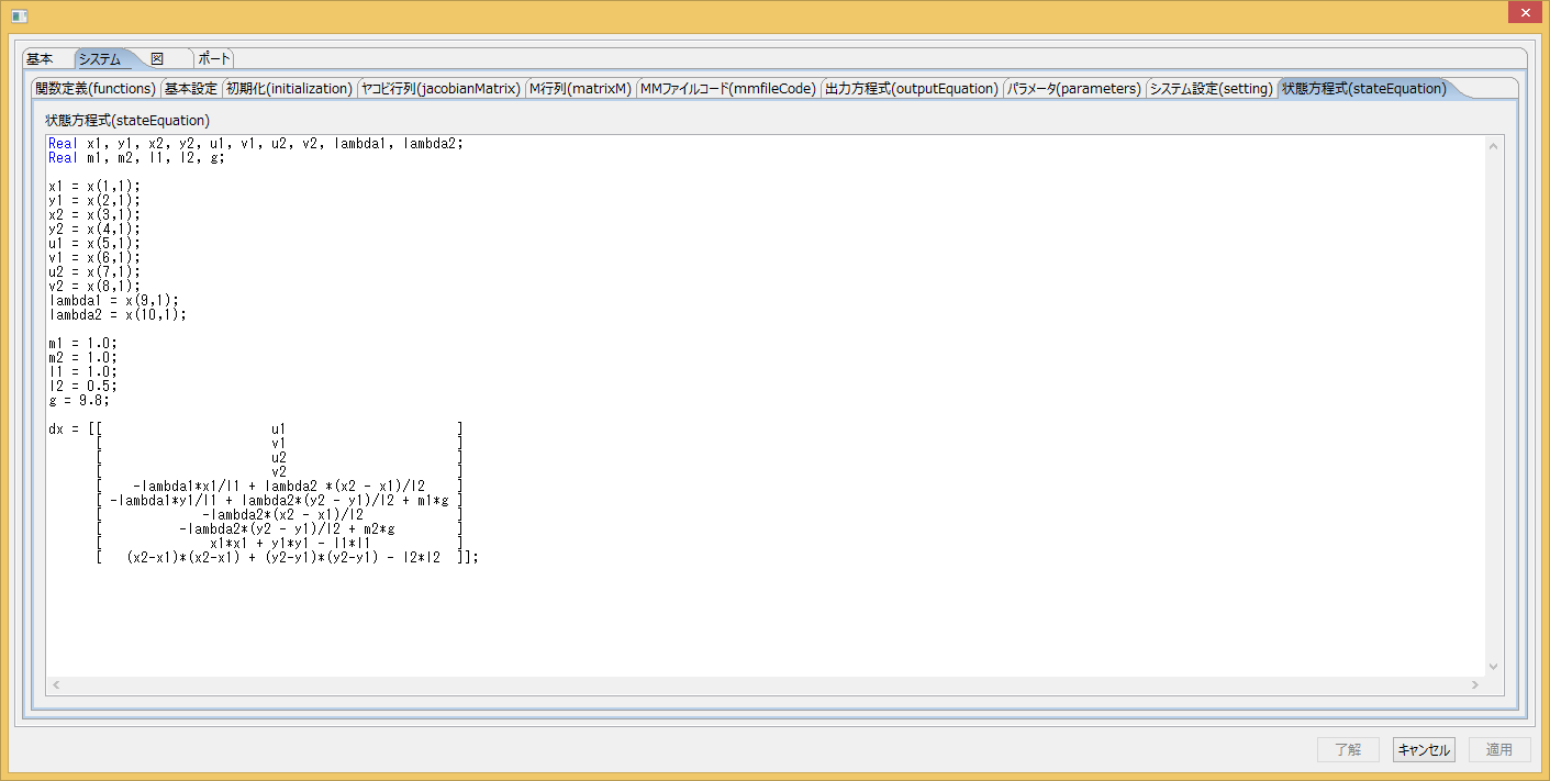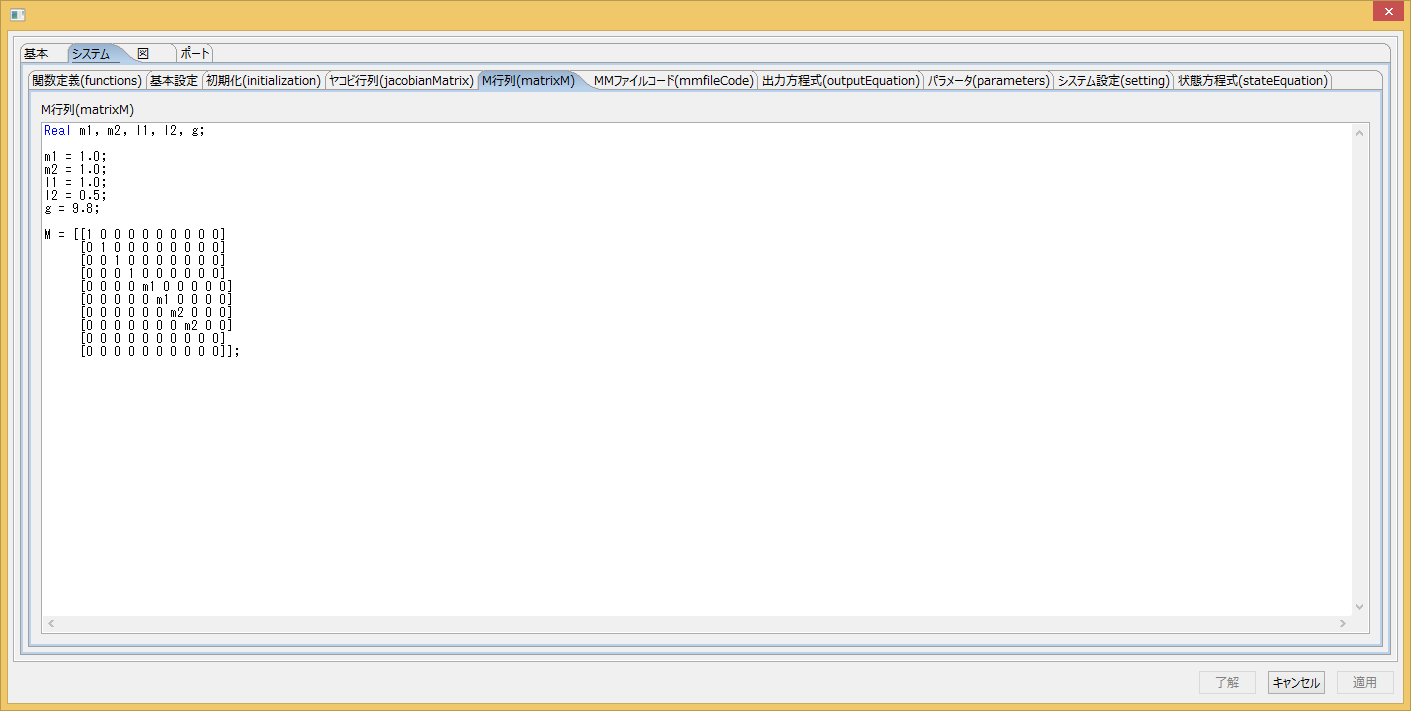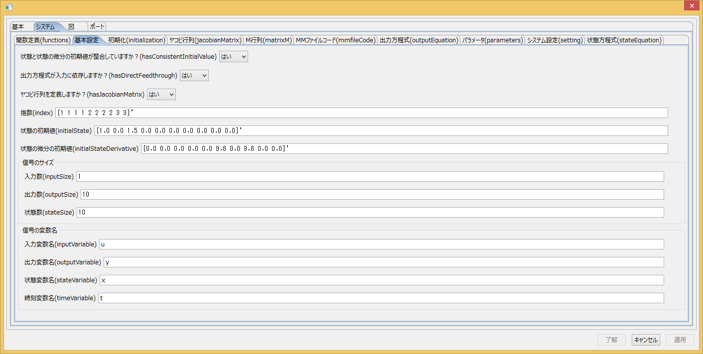 ブロックに数値計算言語MaTXを用いてシステムを記述します。右クリックからパラメーター設定を選択するか、 ブロックをダブルクリックすることでパラメーターの編集画面を開きます。以下にシステムタブの中の設定が必要な項目を示します。 サンプルファイルはDownloadのjamox sampleにあります。