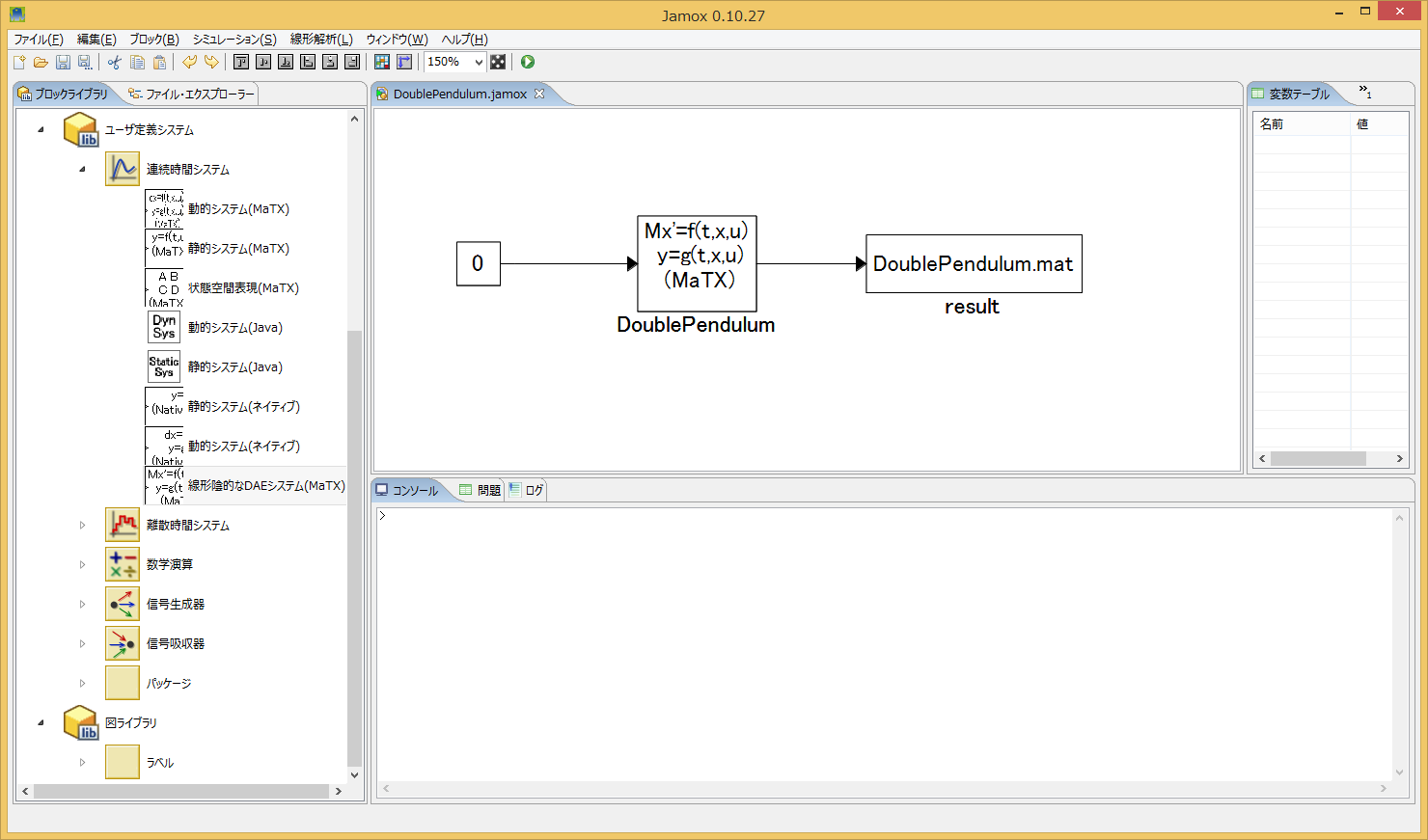 この例題をJamoxで表現するために線形陰的なDAEシステム(MaTX)などその他必要なブロックをブロックライブラリからドラック&ドロップし、 下図のようなブロック線図を作成します。